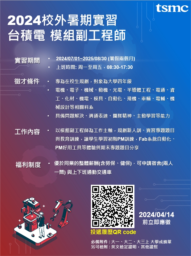 國立中興大學原資中心與台積電合作,今年的模組副工程師(MAE)暑期實習生招募,會透過原資推薦符合條件的同學。