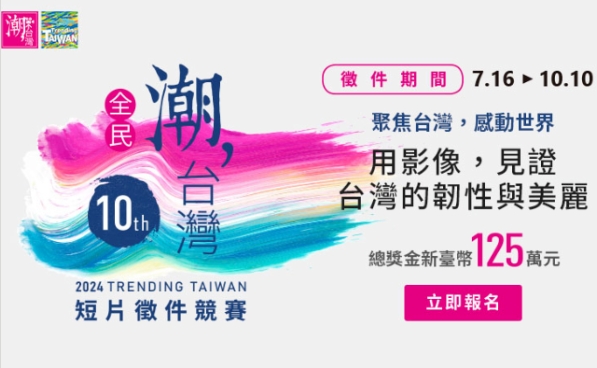 過去10年,「全民潮台灣」短片徵件累積上千部作品,也一起見證,這片土地上的人們,也向國際社會展現台灣的自信、堅強與善良的韌性活力。第10屆「全民潮台灣」短片徵件競賽,再一次邀請您以影像為筆,捕捉這片土地最動人的一面。期待透過大家的原創影像,發掘更多台灣獨特的生命力與美麗,讓世界看見台灣。
