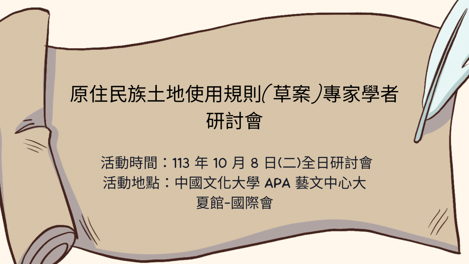 本次研討會議題為「原住民族居住需求」、「原住民族傳統慣俗使用」、 「原住民族土地及部落生活之探討」,辦理之目的即希望透過熟悉原住民族 土地資源利用、原住民土地使用管制項目的專家與學者們,創造一個官方、 學界、產業三方的對話空間,提供原民土管草案相關執行意見,或就原民 土地議題提供建議解套方式,以利國土計畫上路以後,以原住民族土地使 用規則落實原住民族土地使用正義保障原住民族人的生活品質及經濟產業發展