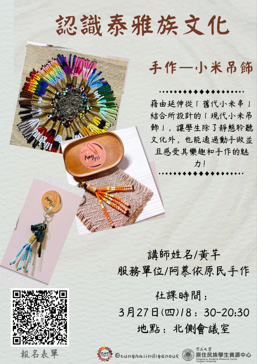 本次邀請Amuy手作的黃芊老師,將透過分享泰雅族文化裡「小米豐收季」的祭典內容, 認識及了解後,可從中知道小米對泰雅族人的重要性。 講座結束後,延伸從「舊代小米串」結合所設計的「現代小米吊飾」, 讓學生除了靜態聆聽文化外,也能動手做感受其樂趣和手作的魅力!