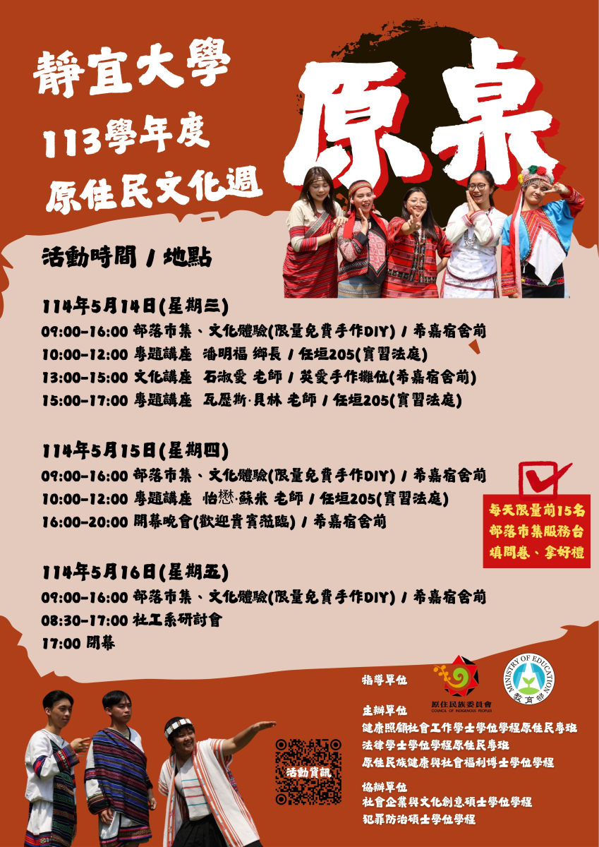 一、活動時間: (一)部落市集及各講座時間:114年5月14日星期三至 5月16 日星期五,為期三天活動,詳細活動資訊請參考網站 https://c017.pu.edu.tw/p/406-1026-61895,r1355. php?Lang=zh-tw。 (二)原桌晚會時間:114年5月15日星期四,下午5時準時開 始,敬邀各學校學生參與晚會活動。