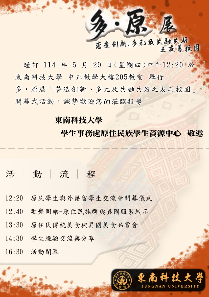 (一)12:20-12:40原民學生與外籍留學生交流會開幕儀式。