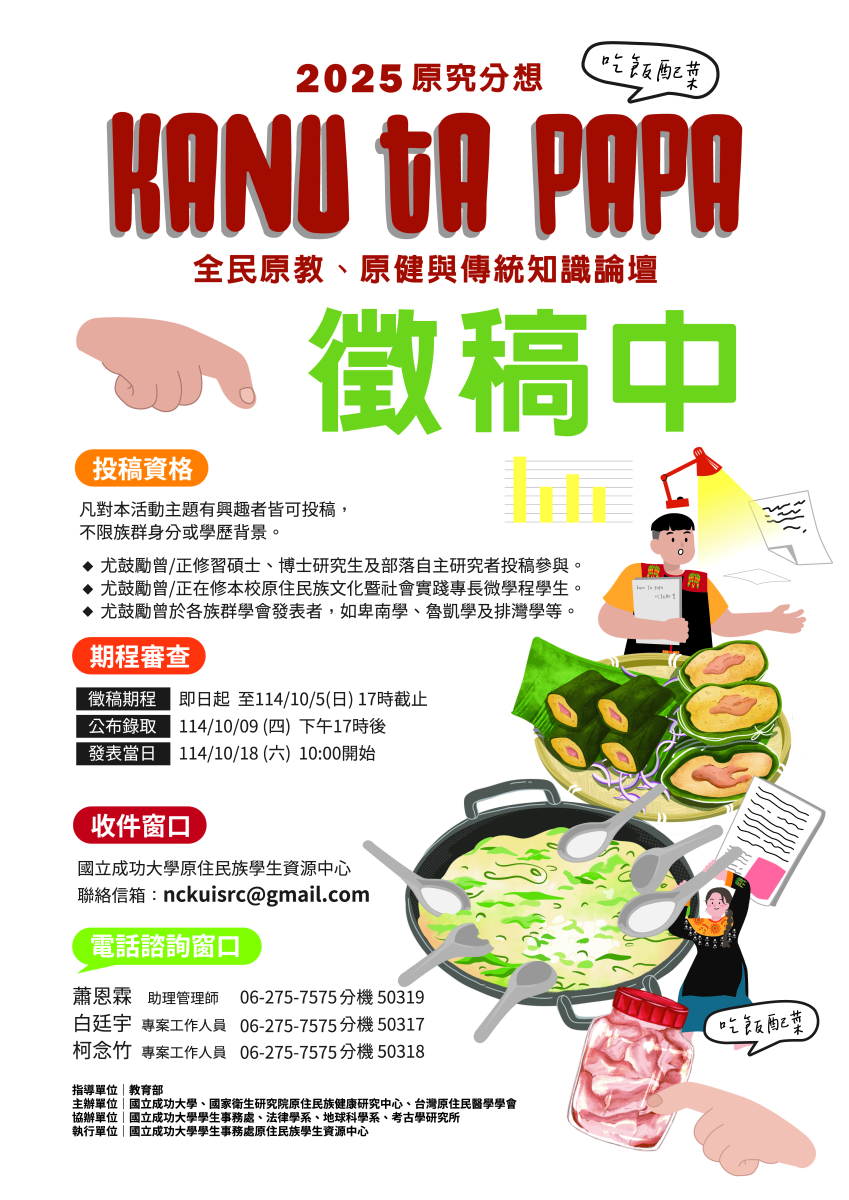 四、活動對象:凡對本活動主題有興趣者皆可投稿,不限族群身分或學歷背景。(一)尤鼓勵曾/正修習碩士、博士研究生及部落自主研究者投稿參與。(二)尤鼓勵曾/正在修成功大學原住民族文化暨社會實踐專長微學程學生。(三)尤鼓勵曾於各族群學會發表者,如卑南學、魯凱學及排灣學等。