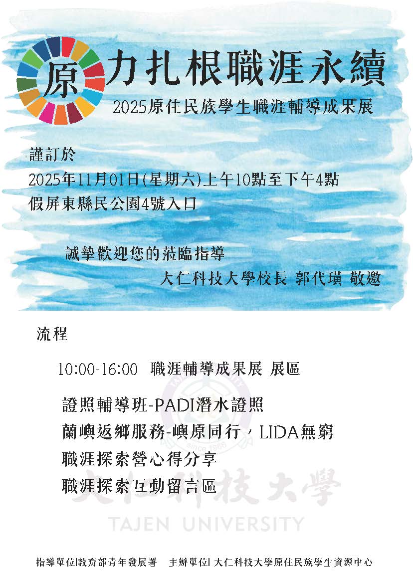 檢附活動資訊如附件,如有未盡事宜請洽承辦人員裘娃小姐,電話:08-7624002#1312;Email:ff931757@tajen.edu.tw。