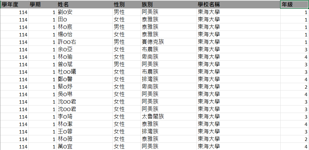 獲獎名單公告-114學年度第1學期原住民學生就讀大專校院獎學金第1階段獲獎名單
