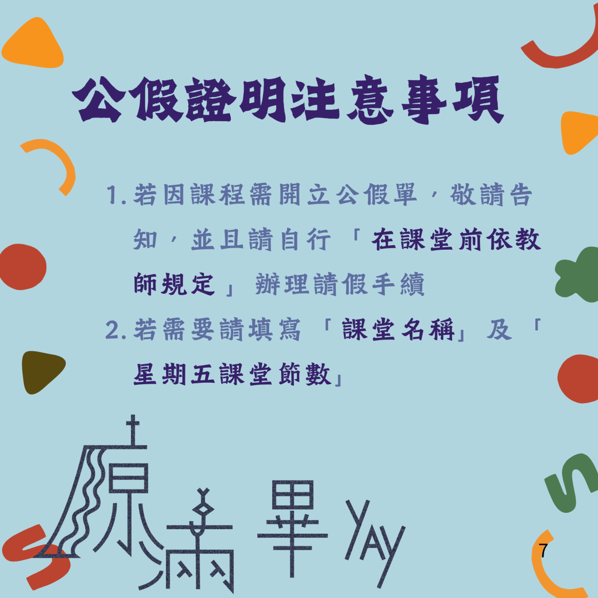 (若因課程需開立公假單,敬請告知,並自行依教師規定辦理公假手續)